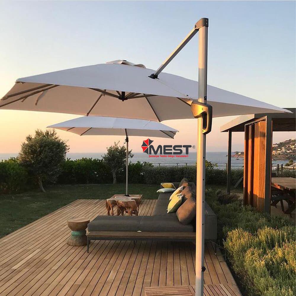 Bahçenizde, havuz kenarında, reklamlarınızda ve balkonda kullanmanız için üretilmiş 6 kollu yuvarlak alüminyum şemsiyedir. Kullanılan alüminyum gövde rengini isterseniz beyaz, isterseniz eloksal olarak seçebilirsiniz. İskelette bulunan plastik parçalar, tüm dünyada şemsiye üretiminde kullanılan kırılmaya karşı 2 yıl garantili, ABS ve POLYAMID PA6 PRIME hammadde kullanılarak üretilmiştir. Şemsiyenizin rüzgar tahliyesi tepe kısmında bulunan hava pencereleri ile yapılabildiği için şemsiyenizi rüzgarlı havalarda güvenle kullanabilirsiniz. Birbirine geçebilen çift borular mandal sistemi sıkıştırılarak istenilen yükseklikte ayarlanabilir. Kullanımı son derece basit olup, orta boru üzerinde bulunan kolların bağlı olduğu ana gövdenin yukarı doğru sürülmesi ile kolların ters açıda kumaşı germesi sonucu şemsiyeniz otomatik olarak sabitlenerek kullanıma hazır hale gelir. Uygun altlık ve 160 gram akrilik kaplamalı polyester veya 250 gram olefin kumaş ile sizi yıllarca güneşten koruyabilir.