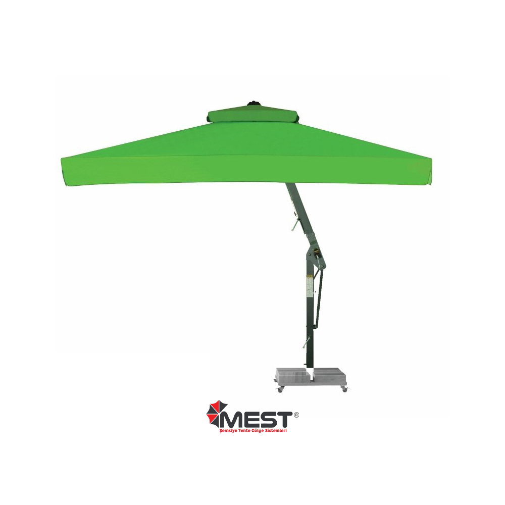 Cafe, restaurant ve havuz kenarı kullanımına uygun üretilmiştir. Şemsiye iskeletinde kullanılan alüminyum Etial 60 dünya standartlarında olup tamamı elektrostatik toz boya ile kaplanmıştır. Şemsiyenin ana taşıyıcı borusu ile kolları birleştiği çark özel alaşımlı alüminyum pres olup kırılmaya karşı dayanıklıdır. İskeletin alüminyum ile plastik parçalarını birleştiren vidaları paslanmaya karşı çinko nikel kaplama yapılmıştır. İskelette kullanılan tüm plastik parçalar, tüm dünyada şemsiye üretiminde kullanılan kırılmaya karşı 2 yıl garantili, ABS ve POLYAMID PA6 PRIME hammadde kullanılarak üretilmiştir. Şemsiye iskeleti üzerinde bulunan kumaş taşıyan kollar 20×40 mm 2,00 mm et kalınlığında olup, diğer destek kolları 20×40 2 mm ölçülerinde özel federli alüminyum profilden üretilmiştir. Şemsiye orta borusu Ø100 mm çapında olup, et kalınlığı 3,5 mm kalınlığındadır. Şemsiyenin çalışması ana gövdenin içinde yer alan çelik dişli mekanizmasının çevirme kolu ile çevrilerek teleskopik borunun yukarı yükselmesiyle hareketlenir ve şemsiye açılıp kapanırken hiçbir şekilde kullanıcıyı rahatsız etmez. Uygun altlık ve 290 gram su iticili akrilik kaplamalı polyester veya 250 gram polyester veya 300 gram akrilik kumaş seçeneği ile sizi yıllarca güneşten korur.