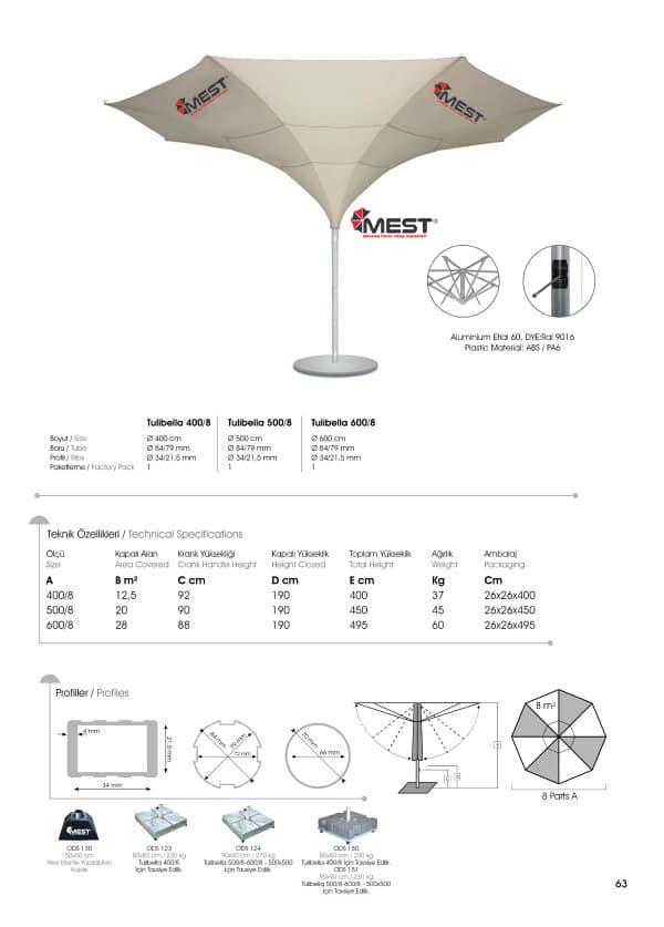 Cafe, restaurant ve tanıtım kullanımına uygun teleskopik sistem ile çalışan kare ve yuvarlak olarak üretilebilen 8 kollu şemsiyedir. Beyaz veya istenilen RAL renkleriyle elektrostatik boya kaplanabilmekte, gövdesi eloksal olarakta üretilebilen şemsiyenizin orta borusu 84 mm’dir. İskelette kullanılan tüm plastik parçalar tüm dünyada şemsiye üretiminde kullanılan kırılmaya karşı 2 yıl garantili ABS ve POLYAMID PA6 PRIME hammadde kullanılarak üretilmiştir. Şemsiyenizin çalışması krank sistemli olup, açma veya kapamak için çevirme kolu yardımı ile dişli sistemini harekete geçirmeniz yeterlidir. Uygun altlık ve 290 gram su iticili akrilik kaplamalı polyester veya 250 gram polyester veya 300 gram akrilik kumaş (10 yıl garantili) seçeneği ile sizi yıllarca güneşten korur.